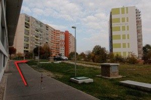 • Projedete pod betonovým mostem pro pěší a dostanete se na křižovatku, kde nalevo je velké parkoviště autobusů. Odbočte doprava a po pár desítkách metrů zase doleva (první odbočka).